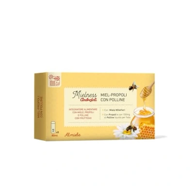 With honey and pollen: ingredients of the hive traditionally used to support daily well-being. Convenience of use: 10 ml single-dose vials to be taken as well or diluted in water as needed. Honey taste: pleasant formulation, ideal even for those who do not like the intense taste of pure propolis.