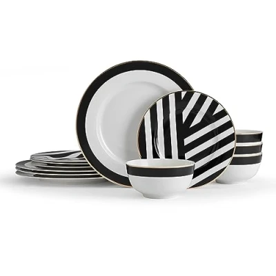 WHAT YOU'LL GET: 12pc dinner set includes 4x 27.5cm dinner plates, 4x 21cm side plates and 4x 14cm cereal bowls ART DECO DESIGN: take it back to the roaring '20s with this dinnerware and its bold, geometric pattern. Perfect for entertaining GENUINE GOLD DETAILS: adorned with genuine gold details to add a touch of decadence to your dining experience DESIGNED IN OUR UK STUDIO: Made from fine china that results in the dinnerware being whiter and more durable. Dishwasher safe with a 10-year guarantee FASHION-FORWARD GIFT: inspired by the art deco revival, this dining collection makes a perfect gift for fashionistas