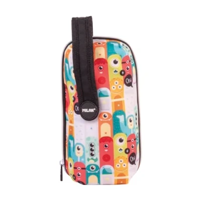 MILAN 4 in 1 pencil case with 4 pencil cases. Keep your school supplies tidy and easy to access. The 4 inner sleeves can be removed and stored with Velcro. School supplies included: 1 x 4024 eraser, 1 x AFILA sharpener, 1 x HB graphite pencil, 3 x P1 pens (blue, black and red), 1 x 15 cm ruler, 12 coloured pencils and 12 x tapered tip markers. Aliens special multi-coloured series, featuring a vibrant stacked alien print, featuring the same characters as the Aliens Tower wooden educational toy, with black inner lining. Fabric composition: outer and inner lining made of polyester. Dimensions: 22.5 x 11.5 x 11 cm.