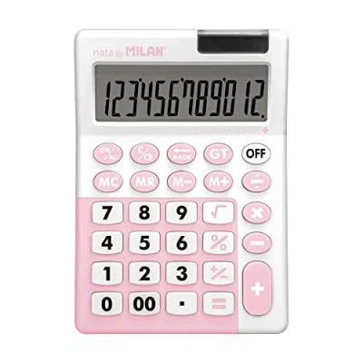 12 Digit Desktop Calculator. Series Edition +, White and Pink. The calculator body and its keys have a built-in biocide. The biocide is silver phosphate glass (CAS 308069-39-8) with antibacterial effect. Ideal for improving hygiene in school, office, food contact environments and sanitary environments. 4 memory keys, square root function, Great Total function and backward function. Off key. Dual power: solar cell and 1.5V battery. Original design created by MILAN R&D department. Calculator measures: 11.8 x 16.2 x 3.8 cm.