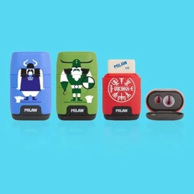 Combination eraser and double pencil sharpener (one standard and one MAXI) with reservoir. Vikings special series COMPACT design. Soft square rubber made of synthetic rubber type 'bread crumb'. The sharpener has a sharp and durable steel blade, ideal for all types of pencils. Sharpener with safety blade: This system prevents the blade from being separated from the sharpener body. 3 assorted colours: blue, red and green. Original design created by R&D department of MILAN. Replacement erasers available (model 430). MILAN erasers are made in Spain since 1918.
