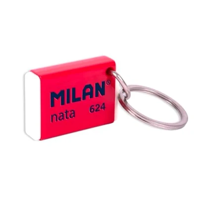 Keyring with the shape and design of the MILAN cream 624 eraser. Pink and White MILAN nata 624 collection, inspired by the original colors and design of MILAN erasers, made in Spain since 1918. Dimensions: 4 x 2.8 x 1 cm.
