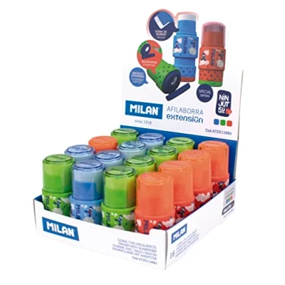 Display box 16 EXTENSION special series ninja. Combination of eraser and pencil sharpener with tank. EXTENSION Design, Ninjutsu Special Series. Soft rubber made of flexible synthetic rubber. The sharpener has a sharp and sturdy steel blade, ideal for all types of pencils. Safety Blade Sharpener - This system prevents the blade from being separated from the body from the sharpener. Extendable tank. Original design created by MILAN's R&D department. Contains 5 pieces of red, 6 pieces of green and 5 pieces of blue. Replacement rubbers available.