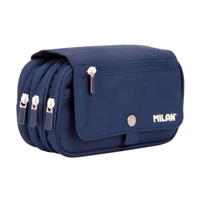 Large capacity pencil case with 3 zip pockets and a small front pocket on the flap. Snap button closure. 1918 Series Navy Inspired by the original colors and design of MILAN erasers, manufactured in Spain since 1918. Navy blue printed inner lining with a grid that evokes the shapes of the MILAN rubbers. Ripstop outer fabric: lightweight and resistant to rips and tears. It uses a special technique that weaves thick reinforcement threads at regular intervals in a criss-cross pattern. Fabric composition: polyester. Dimensions: 13 x 24 x 10 cm.
