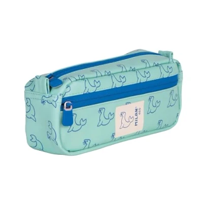Rectangular pencil case with 2 zips. Small front pocket and main compartment with blue zippers. Blue printed inner lining. Collection 460 since 1918, inspired by the original colors and design of MILAN erasers, manufactured in Spain since 1918. Green with navy blue seal print. Fabric composition: outer made of polyurethane (high quality with soft touch) and polyester inner lining. Dimensions: 21 x 8.5 x 6 cm.