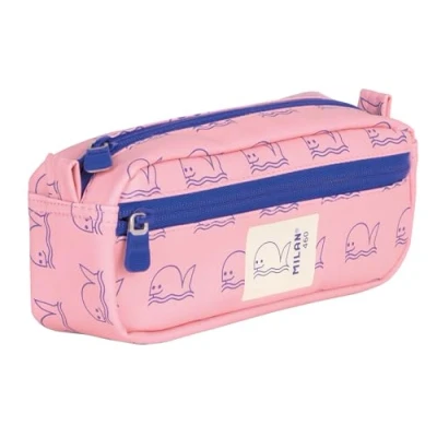 Rectangular pencil case with 2 zips. Small front pocket and main compartment with blue zippers. Blue printed inner lining. Collection 460 since 1918, inspired by the original colors and design of MILAN erasers, manufactured in Spain since 1918. Pink with navy whale print Fabric composition: outer made of polyurethane (high quality with soft touch) and polyester inner lining. Dimensions: 21 x 8.5 x 6 cm.