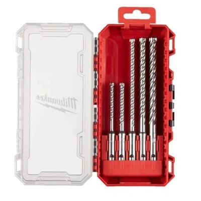 Milwaukee 4932498298 SDS Plus MX4 Drill Bits 4 Cut 5 Piece Symmetrical 4 cutter geometry (4 x 90°). Perfect round holes for optimal anchor fitting. New sharper angled tip design for easy spot drilling with pinpoint accuracy and increased performance on rebar. One piece solid full welded carbide tip on 5-10 mm and one piece slotted carbide tip on 12-32 mm for best lifetime. 4 flute geometry: The high volume 4 flute geometry ensures the optimum removal of dust and debris.