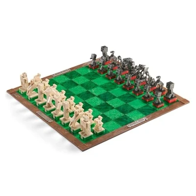 Elevate your game with this unique chess set that combines the strategic world of chess and the online world of Minecraft for players from noobs to grandmasters. The 18" square chess board features a wood-like frame around a playing surface of ‘‘grass’ in textured shades of green, surrounded by Minecraft logos in a metallic finish, suitable for the game of kings (and Steves). This set includes 32 game pieces with textures and finishes that resemble marbled stone, obsidian, redstone or emerald. Like most things in Minecraft, some assembly is required! The board arrives as four interlocking quadrants which can be easily disassembled for more convenient storage. For Minecraft fans ages 8+, Manufacturer: The Noble Collection