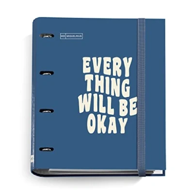4 ring binder 35 mm navy blue with rubber closure. Includes refill pack 100 sheets in 5 pastel colours, 4 dividers and envelope. Contains 1 pad of 100 sheets of A4 square 5mm in 5 colours (20 sheets per colour). 5 stripes in pastel colours for better organisation and headers for titles. Paper size: 210 x 297 mm (A4) Extra opaque 90gsm of excellent quality. It prevents the ink from penetrating and thanks to the quick drying, the irradiation is also braked. The high-quality offset printing of the strip ensures higher fineness and cleaning by highlighting the writing making reading and learning easier. Cover made of extra strong cardboard, lined with printed and glossy laminated paper with rubber closure. Everything will be okay cover image Made from sustainable paper. FSC-MIX CREDIT certified to ensure the paper comes from environmentally responsible forests. Made in Spain.