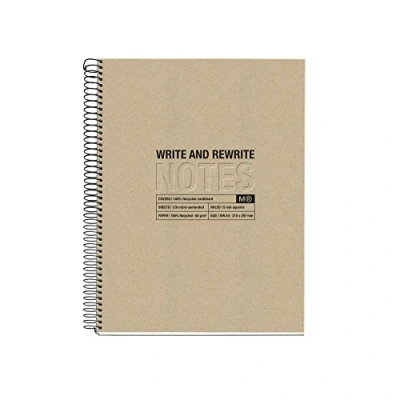 Miquelrius Black Notebook Size A4 (210 x 297mm) 100% recycled printed cardboard covers (recovered after consumption) with screen print and engraving. Black spiral Paper: Extra opaque 80 g/m2 and 100% recycled (recovered after consumption) with Blue Angel and EU Ecolabel certificate. Forest certification: FSC Recycled Credit Sheets: 120 (30 per colour), micro-perforated for clean start and with 4 holes for filing. Stripes: 5mm grid with coloured bands for sorting and header for titles. Binding: Spiral with coilock system Allows the notebook to be flattened as well as for a complete twist.