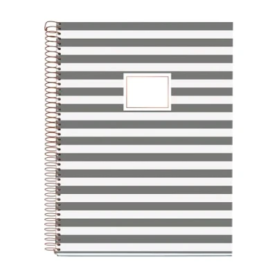 Miquelrius White and Grey Stripes Notebook Lined A4 (210 x 297 mm) Envelope made of printed and matt laminated cardboard. Spiral and stamping details in copper. Black smooth border Paper: extra opaque 70 g/m². Sheets: 120 (30 per colour), micro-perforated for clean starting and with 4 holes for filing. Rule: 5 mm squared with coloured stripes for classification and headboard for titles. Certification: FSC Mix Credit Binding: spiral binding with coilock system allows the notebook to be opened flat and gives the complete turn.