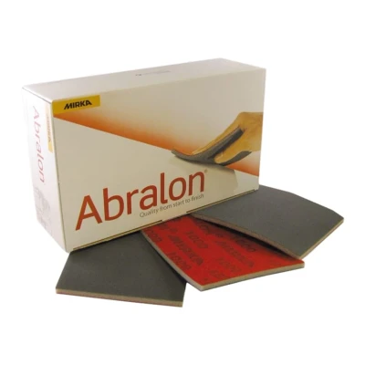 Mirka Abralon hand pads are one of the most innovative products from the high-end Mirka brand. Abralon is a unique and high-quality product that can sand flat and uneven surfaces. The patented system minimises the chance of unevenness due to pressure difference. Also, Mirka has ensured that sand and water easily move off the sanding surface. Abralon can be used both wet and dry for applications from coarse matting (500 grit) to micro polishing (4000 grit). For restoring painted surfaces, we recommend a minimum of three sanding steps with 1000, 2000 and 3000 grit. Benefits of Mirka Abralon Unique patented Mirka product. Open cell structure for water retention. Can be used both dry and wet. Always equal pressure due to the foam backing. Creates an excellent stripe pattern. Applications Cars. Construction & decoration. Woodworking. Metal processing. Composite processing. Ships. Vehicles. Suitable materials Aluminum Hardwood Soft steel/carbon steel Non-ferrous metal Sanding paint Paint Plastics Solid surfaces Stainless steel Steel Glass Copper and bronze Glass fibre Specifications Dimensions: 115 x 140 mmThickness: approx. 5 mm (with foam backing)Attachment: velcroScope of delivery: per piece or 20 piecesGrain: silicon carbideBonding: special resinBase: nylon woven net on foam rubberColour: grey