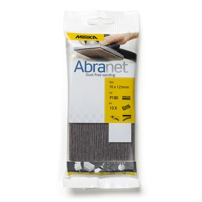 Box contents: Mirka Abranet mesh sanding belt 70 x 125 mm, grit P180, 10 pieces per pack. Suitable for vibrating sanders, manual sanding blocks and manual sanding Areas of application: Abranet is suitable for sanding wood, putty, paint, plastic and metal Healthy, dust-free sanding like a professional: the Abranet abrasive net has many small holes; it allows virtually dust-free sanding when sanding with suction; this prevents inhaling dangerous dust High quality and durability: Optimal dust suction prevents clogging of the abrasive. Abranet offers effective material removal, long service life and smooth surfaces, even without suction Grain type: aluminium oxide, binder: synthetic resin, backing: polyamide fabric, closed dispersion, grain sizes are standardised Fepa (which is why the P is placed in front of the grain indication)