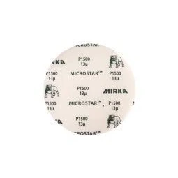 Mirka Microstar sanding discs are ideal for fine sanding applications, specifically designed for matting and correcting paint and clear coat surfaces. Featuring an advanced stearate coating and a smooth film backing, these discs deliver a long-lasting, high-quality finish. Microstar sands more efficiently than traditional abrasives, as it is less prone to clogging. It produces a fine, uniform scratch pattern that is easy to polish out for a flawless final result. For optimal performance, we recommend using Microstar in combination with a 5 mm interface pad. Note: Microstar is intended for dry sanding only. Tip: Mirka Microstar sanding discs are also available per 5 discs. Benefits of Mirka Microstar New innovative abrasive. Polyester backing instead of paper. Lasts much longer than traditional sandpaper. Gives smoothest results due to high flexibility. Specifications Grit sizes: P800, P1000, P1200, P1500, P2000, P2500Diameter: 150 mmPackaging: per box (50 discs) Properties Colour: whiteBacking: polyester filmAttachment: velcroGrain: aluminum oxideBonding: low VOC resin systemCoating: semi-open