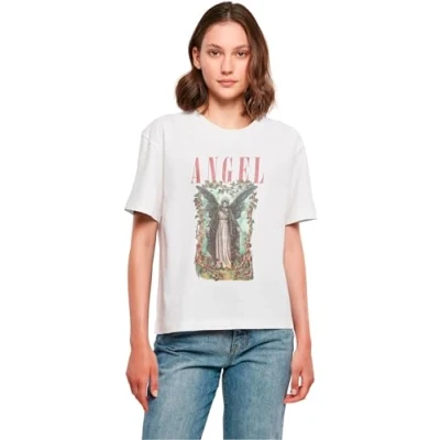 Statement design: the impressive angel print and the large "Angel" lettering make this T-shirt a real eye-catcher. Ideal for women who want to express their individual style. Comfortable material: made of soft cotton, the T-shirt offers excellent wearing comfort, ideal for long days and relaxed evenings. Comfortable cut: the classic regular fit ensures a loose, comfortable fit that can be combined in many ways and goes with many different outfits and styles. VERSATILE: Perfect with jeans, skirts or shorts, this t-shirt is suitable for various occasions, from leisure activities to relaxed gatherings with friends. Easy care: the t-shirt is machine washable and easy to care for, so it retains its shape and colour brilliance even after many washes and looks like new for a long time.