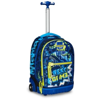 Dimensions: 46 x 21 x 34 cm; Capacity: 33 litres Back: Padded and covered in fabric; Straps: Padded and covered in fabric Pockets: Front pocket, side pocket and shoulder strap pocket. Other features: Trolley with large double compartment and telescopic handle adjustable according to the height of the child. The 7 cm diameter wheels in soft rubber allow you to cushion holes and doses on any type of path. Backpack use: thanks to its retractable Fast'n Go shoulder straps. Fabric: 900D resin polyester