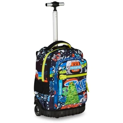 Dimensions: 46 x 21 x 34 cm; Capacity: 33 litres Back: Padded and covered in fabric; Straps: Padded and covered in fabric Pockets: Front pocket, side pocket and shoulder strap pocket. Other features: Trolley with large double compartment and telescopic handle adjustable according to the height of the child. The 7 cm diameter wheels in soft rubber allow you to cushion holes and doses on any type of path. Backpack use: thanks to its retractable Fast'n Go shoulder straps. Fabric: 900D resin polyester