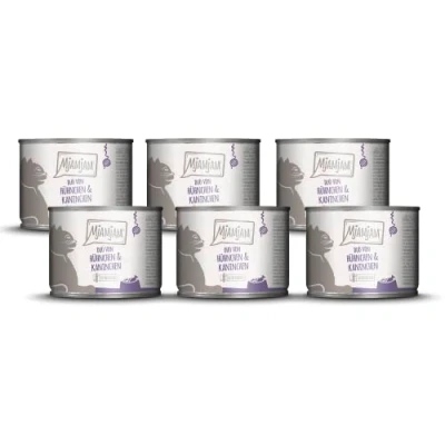 Grain-free, natural cat food with extra high meat content The complete feed from MjAMjAM offers species-appropriate, natural and prey cat nutrition. Our most important supplier, nature, provides us with all the important components to meet our philosophy and the needs of your favourite For our meals, we mainly use ingredients that come from regional farms. Raised or grown with love, these are subject to the strictest quality controls. We only process ingredients in 100% food grade Animal welfare is our top priority. For this reason, we deliberately do not use dyes and attractants, sugar, gluten, cereals and soy, vegetable by-products as well as synthetic preservatives Composition: chicken 56% (chicken meat, chicken stomachs, chicken liver), meat broth, rabbit 14%, pumpkin 4%, minerals, linseed oil, seaweed flour