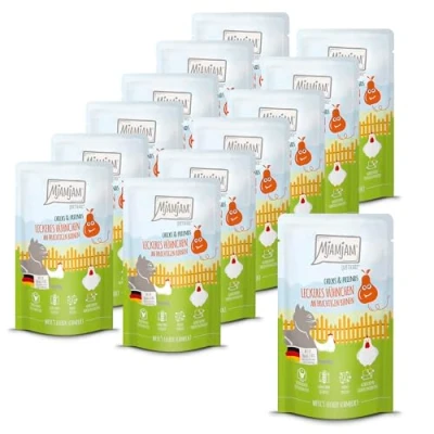 MjAMjAM Premium wet food for cats Quetschie Chicks & Friends delicious chicken with fruity pears, 12 pack (12 x 125g), grain free