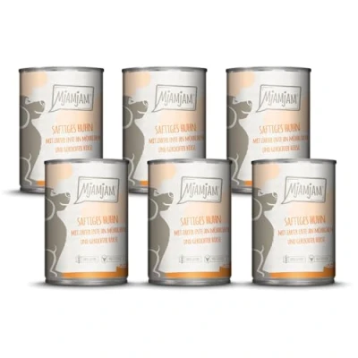 MjAMjAM premium wet food for dogs juicy chicken with tender duck on carrots and boiled millet, pack of 6 (6 x 400 g), grain free extra meat