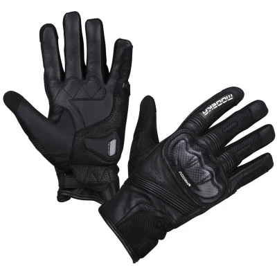 Miako Air Gloves black Matt sporty carbon look: The new Miako sports glove family offers the protection and comfort you desire. Both models feature a carbon knuckle protector and palm slider. Mesh inserts, perforations and finger vents offer a good air circulation. Try it on and experience it yourself. Features: Certified to EN 13594:2015 Carbon palm grinder Material doubling and TPU protector on the little finger Carbon knuckle shell Touch Tip: easy operation of smartphone and navigation system AirFlow: ventilation through mesh inserts AirFlow: perforated leather inserts AirFlow: 3D mesh inserts on fingers, thumb and lower back of the hand, perforated leather inserts on thumb, toe and back of the hand Leather inserts on thumb, index, middle and ring finger Pre-shaped finger/silhouette of the glove Soft and comfortable lining Unlined palm for good grip Textile stretch between fingers for comfortable movement Velcro at the glove fastener Material: Outer fabric: Goatskin