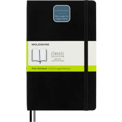 This version of the Expanded black classic 400-page notepad with 2 bookmarks will help you keep track of long-term projects and great ideas. Take notes, write down your to-do lists and tick off all your day's tasks Classic design with soft cover, elastic closure and a matching bookmark ribbon takes you straight to the right page every time. Expandable back pocket for storing items like tickets or souvenirs Classic notebook with colored cover, rounded corners and plain pages. 'In case of loss' notice printed on the flyleaf Lies flat and opens at 180. Reusable paperband that also features additional printed tools. The history of Moleskine is printed within all our produts International products have separate terms, are sold from abroad and may differ from local products, including fit, age ratings, and language of product, labeling or instructions.