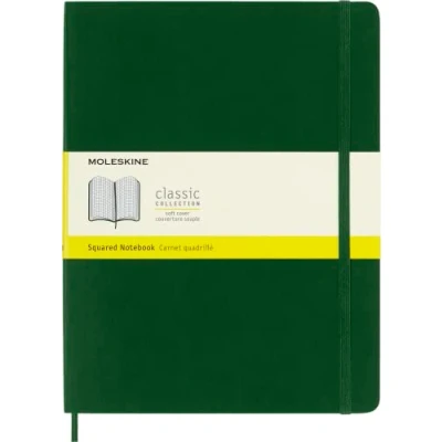 The classic and legendary Moleskine notebook is tinged once again with new colours and shading maintaining the iconicity and characteristics of the most loved notebook Classic design with elastic closure and a convenient bookmark to never lose your place. On the back, an expandable pocket to hold important notes and papers The notebook has 192 pages with squared layout and ivory-coloured 70 g/m² acid-free paper and the iconic "In case of loss" notice for your contact information in case you lose your notebook On the B-SIDE of the reusable band, additional instruments are printed. The Moleskine story is printed inside all our products. Opens totally at 180° The package contains a notebook with squared layout and soft cover, available in size extra large 19 x 25 cm, 192 pages, myrtle green