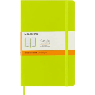 The classic and legendary Moleskine notebook is tinged once again with new colours and shading maintaining the iconicity and characteristics of the most loved notebook Classic design with elastic closure and a convenient bookmark to never lose your place. On the back, an expandable pocket to hold important notes and papers The notebook has 192 pages with ruled layout and ivory-coloured 70 g/m² acid-free paper and the iconic "In case of loss" notice for your contact information in case you lose your notebook On the B-SIDE of the reusable band, additional instruments are printed. The Moleskine story is printed inside all our products. Opens totally at 180° The package contains a notebook with ruled layout and soft cover, available in size Large 13 x 21 cm, 192 pages, lemon green