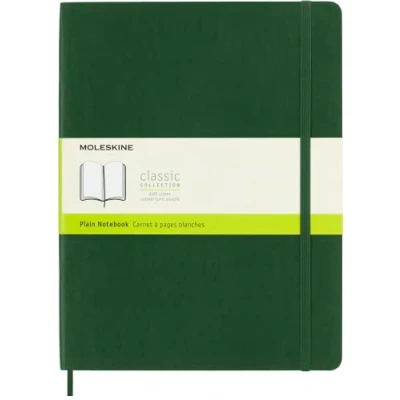 The classic and legendary Moleskine notebook is tinged once again with new colours and shading maintaining the iconicity and characteristics of the most loved notebook Classic design with elastic closure and a convenient bookmark to never lose your place. On the back, an expandable pocket to hold important notes and papers The notebook has 192 pages with plain layout and ivory-coloured 70 g/m² acid-free paper and the iconic "In case of loss" notice for your contact information in case you lose your notebook On the B-SIDE of the reusable band, additional instruments are printed. The Moleskine story is printed inside all our products. Opens totally at 180° The package contains a notebook with plain layout and soft cover, available in size extra large 19 x 25 cm, 192 pages, myrtle green
