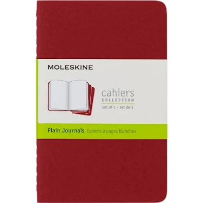 The notebooks have a sturdy red cardboard cover with visible thread binding The notebooks have a stable one. The last 16 pages can be removed With a large inner pocket for loose notes; blank, chlorine-free bleached paper Dimensions (cm): 9x14