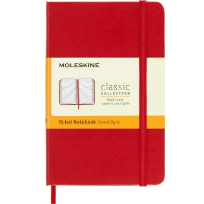 The classic and legendary Moleskine notebook is once again updated with new colors and designs, but maintaining the iconicity and features of the brand's classic best-selling notebook Classic design with elastic closure and a convenient bookmark to never lose the page. On the back there is a folding flap for storing important notes and papers Notebook has 192 lined pages and 70gsm acid-free ivory paper and the iconic "In case of loss" notice to write your contact information in case you lose your notebook On the back cover of the notebook are themed designs and the unmistakable Moleskine story inside all our products, an iconic detail of the brand. Can be opened 180º Pack contains one Moleskine Classic Hardcover Ruled Notebook - Available in Pocket Size 3.5" x 5.5", 192 Pages, Scarlet Red