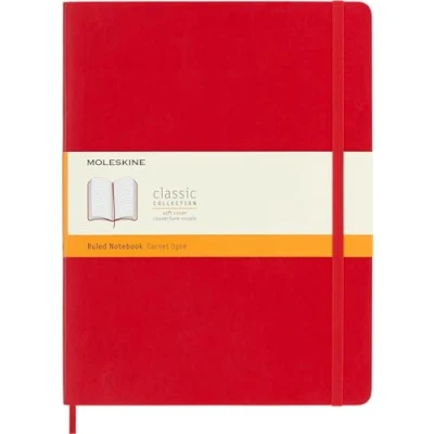 The classic and legendary Moleskine notebook is tinged once again with new colours and shading maintaining the iconicity and characteristics of the most loved notebook Classic design with elastic closure and a convenient bookmark to never lose your place. On the back, an expandable pocket to hold important notes and papers The notebook has 192 pages with ruled layout and ivory-coloured 70 g/m² acid-free paper and the iconic "In case of loss" notice for your contact information in case you lose your notebook On the B-SIDE of the reusable band, additional instruments are printed. The Moleskine story is printed inside all our products. Opens totally at 180° The package contains a notebook with ruled layout and soft cover, available in size extra large 19 x 25 cm, 192 pages, scarlet red