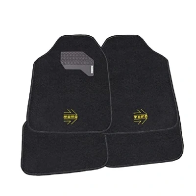 GENERAL: Set of 4 universal MOMO car mats suitable for almost all vehicles. This car mat set includes the two front mats for the driver and front passenger and the two rear mats. They are friction-resistant MOMO quality mats that combine tradition and innovation and are suitable for all weather conditions. MATERIALS AND MEASUREMENTS: MOMO universal car mats made of polyester and PVC. These MOMO car mats will give a new look to your car and will protect it from possible stains and wear and tear (they have anti-wear reinforcement at the feet). As for the measurements, the front mats measure 65x43cm and the rear ones 29x40cm. DESIGN: Car mats with black carpet design, white stitching and reinforced heel pad on the driver's mat with the MOMO logo in white. They also have the MOMO logo on the front mats in yellow (at the bottom). SAFETY AND CLEANLINESS: These universal car mats are anti-slip on the reverse side and have excellent adhesion to the floor to ensure greater safety. They are easy to clean with a damp cloth and look as good as new with a hoover. REFERENCE: MOMLCM015BY