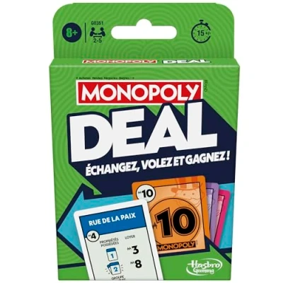 Fast monopoly card game: we trade and fly to win the Monopoly Deal card game, a favorite of families! The Monopoly game is found in a fast-paced card game for kids and adults. ONE PART CAN LAST 15 MINUTES: Buy, sell, trade and earn even faster! A game of Monopoly Deal card game can last just 15 minutes, perfect for family play at any time of the day COLLECT 3 PROPERTY GROUPS TO WIN: In this captivating strategic card game, the first player to collect 3 groups of different color properties wins ACTION CARDS CHANGE PART: Action cards can be used to collect rent, steal and trade, or receive money from other players when "it's your birthday" EASY TO LEARN: The Monopoly Deal card game can be learned, taught and played in an instant. It even contains handy reference cards to remind players what to do in turn, as well as tips and rules of the game, Manufacturer: Hasbro