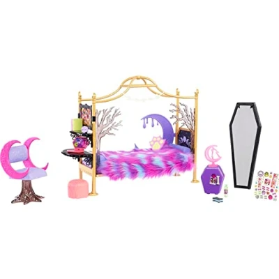 Kids can expand their Monster High world with the Clawdeen Wolf playset and collect other dolls and playsets for more frighteningly fabulous fun! Each sold separately, subject to availability. The gore-geous gold bed features physical details such as branches, a series of stars, crescent cutouts and paw cushion. A fluffy faux fur blanket makes things more comfortable! Stimulates imagination and provides horrible fun What an impressive set! The tiered desk and chair come with accessories such as a bulletin board, two books, a piece of skullette, a laptop and a stylized wolf and moon decorative item., Manufacturer: Mattel