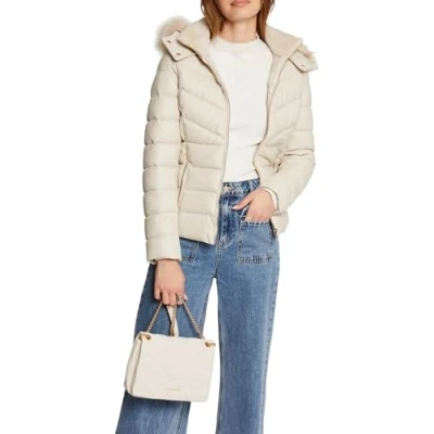 Short down jacket Ivory Removable hood with faux fur Material: PU leather 2 zip pockets Waist adjusted by an elastic band on the back