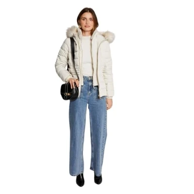 Short ivory puffer jacket Faux fur on hood 2 zip pockets Fitted with elastic on the back