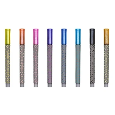 Metallic look ✓ Cool felt tip pens with highlight effect for painting, marking, organising and designing cards, letters, scrapbooking, photo books or journals for home office, school etc. Innovative wow effect ✓ The markers have a tip of approx. 2 mm and paint in a silver metallic look with a coloured contour – so you can easily apply two colours to the paper Great colour combination ✓ The set includes 8 pens with cool metallic contour colours: yellow, gold, orange, pink, purple, light blue, dark blue and black Beautiful design: functionality and colourful design of these markers illustrated with dots and sayings, make every creative work a very special project. With a length of approx. 13.5 cm, the pens fit in any pencil case Easy to use: Shake vigorously before use and press the tip onto the paper several times until it fills with colour - and you're ready to paint