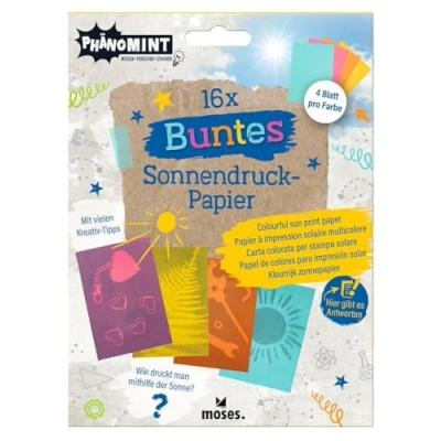 Fascinating sun photography ✓ Create art with light and water: place objects on the paper, let the sun's rays act and fix with water - this creates magical, light-drawn images to amaze Colourful discovery and amaze ✓ 16 sheets in different colours for creative experiments with light and shadow - ideal for capturing patterns, shapes or natural objects impressively as unique works of art Experience natural science playfully. Understand physical principles through the power of the sun: the set easily conveys how light, shadows and chemical reactions work together in photography Perfect gift for young explorers. An exciting experiment set for curious children aged 6 and up - ideal as a gift for small researchers, as a creative leisure activity or as an experiment for school and nursery PhenoMINT - Fun with Science ✓ The range of moses. Inspires children with innovative experiments and lets them explore scientific phenomena playfully through their own experiences and discoveries, Manufacturer: moses. Verlag GmbH