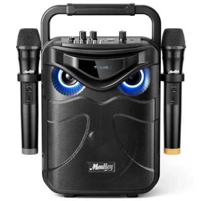 đ€ăExcellent Karaoke SoundăMoukey MPS3 karaoke machine is equipped with 6.5'' woofer and 1'' tweeter for full range stereo sound reproduction and amplifiering your voice, which also makes the bass stronger and more balanced, plus it does not distort the audio, even at higher volumes. The karaoke system is equipped with shining and cool owl eye LED lighting effects, you can turn it off when you don't need it. đ€ăLightweight & PortabilityăMoukey MPS3 karaoke system is small and light, it weighs 2 KG, the handle on the head allows you to carry it anytime and anywhere for parties, beach, outdoor, etc. đ€ăRechargeable BatteryăThe powerful rechargeable battery of MPS3 PA speaker could provide you a long non-stop music playing, it can be used plugged in or charged. So that you can rock out to your favorite songs without the restrictive cords whether it's at an indoor dance or outdoor gathering. đ€ăAll-In-One Karaoke SystemăMPS3 PA speaker can be useed in many ways: Built in Bluetooth 5.0, supports connect wirelessly with most Bluetooth device (such as mobile phone, laptop and tablets); Micro TF card playing (below 32G); Flash USB playing (below 32G); AUX IN, play by aux cable; FM radio, search FM channels to play. đ€ăGreat for Get-togethersăEquipped with two microphones which each take two AA batteries(not included), the microphone holders on both sides can place idle microphones, no more worry about missing the microphone. There is also a 6.35 mm plug in for a wired mic, perfect for karaoke sing solo, duets or trio, parties, class room, gym.