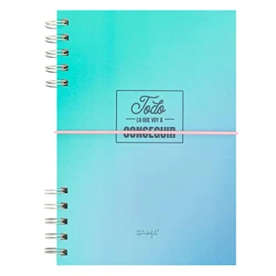 Blue A5 notebook with spiral binding. This spiral is divided into two parts, which gives it originality. It has 80 sheets of 90g paper. Interior guideline: striped. FSC certified, which guarantees that it has been manufactured with paper from responsibly managed forests.