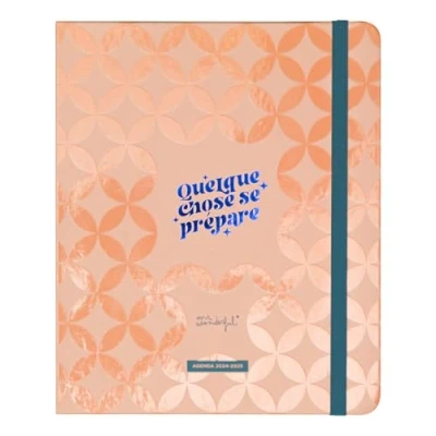 Mr. Office Style Diary Wonderful, a new type of design that we introduced a few editions ago. It is slightly more sober and discreet than our more classic style, so it will appeal to a slightly older audience. This diary has 18 months of organization: runs from July 2024 to December 2025, with weekly organization. Its hidden spiral binding gives it a sophisticated touch. 226 pages of 100gsm paper with FSC certification Daily motivational phrases/ Tabbed dividers for each month//Hidden spiral binding//Inner cardboard pocket//Plastic ruler inside//8 sheets of stickers Schedules and calendars (from the last half of 2024 as well as 2025 and 2026 in full)//Pages to note contacts//Tables to monitor savings//Closure by elastic band A monthly planner at the beginning of each month//Self-adhesive notepads with shapes//An exclusive playlist//Super fun monthly phrases
