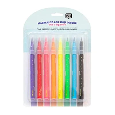 Set of 8 markers that can't be missing in your backpack or at any school. Available in 8 eye-catching shades: blue, green, purple, red, pink, yellow, orange and black. Printed and with transparent cap. Original Tipi Studio by Mr. Wonderful Unique and high quality materials.