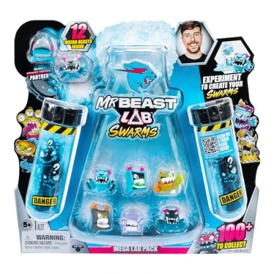 Collectors will add water into the test tube, give it a vigorous shake, and witness 4 out of the 12 MrBeast Lab Swarms emerge from a cluster of fizz. The MrBeast Lab Swarms are 1" (2.5cm) tall. Each pack includes a Special Edition Hard Head Panther. There are over 100 unique MrBeast Lab Swarms to collect. Will your collector discover the Limited Edition Hyperchrome Panther character?, Manufacturer: Moose Toys