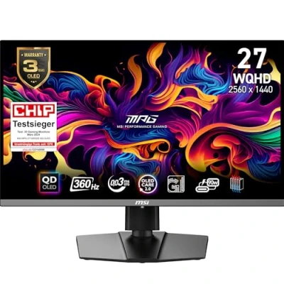 QUANTUM DOT OLED - The QD-OLED gaming monitor combines 10-bit Quantum Dot color conversion with self-illuminating OLED pixels for unsurpassed dark levels and first-class response time; optimized sub-p 26.5 INCH WQHD, 10-BIT COLORS - The Quantum Dot OLED panel displays 1.07 billion colors (10-bit, 99% DCI-P3) with extreme Delta E ≤2 color accuracy; VESA DisplayHDR True Black 400 certified (1500000:1 360Hz Refresh Rate, 0.03ms Response Time - High 360Hz refresh rate and incredible 0.03ms (GtG) response time ensure an astonishing VESA ClearMR 13000 rating; premium graphene-coated heatsink (fanless) GAMING INTELLIGENCE - MSI GI software offers OLED Care 2.0 to prevent burn-in, AI-assisted software (Smart Crosshair), console modes, and gaming assistance; supports KVM 1.0, PiP/PbP; RGB lighting, an
