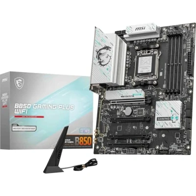 ULTRA POWER - SUPPORTS THE LATEST RYZEN 9000 PROCESSORS IN HIGH PERFORMANCE - The B850 GAMING PLUS WIFI employs a 12 Duet Rail Power System (P-PAK) VRM for the AMD B850 chipset (AM5, Ryzen 9000 / 8000 / 7000) with Core Boost architecture FROZR GUARD - Excellent cooling features such as 7W/mK MOSFET thermal pads, extra choke thermal pads and an Extended Heatsink; Includes chipset heatsink, EZ M.2 Shield Frozr II, a Combo-fan (for pump & system) header (3A) DDR5 MEMORY, PCIe 5.0 x16 SLOT - 4 x DDR5 DIMM SMT slots enable excellent memory overclocking speeds (1DPC 1R, 8200+ MT/s OC); 1 x PCIe 5.0 x16 SMT slot (128GB/s) with Steel Armor supports cutting-edge graphics cards TRIPLE M.2 CONNECTORS - Storage options include 1 x M.2 Gen5 x4 128Gbps slot with EZ M.2 Shield Frozr II to prevent thermal throttling, 1 x M.2 Gen4 x4 64Gbps slot and 1 x M.2 Gen4 x2 32Gbps slot CONNECTIVITY - Network hardware includes a full-speed Wi-Fi 7 module with Bluetooth 5.4 & 5Gbps LAN; Rear ports include USB 10Gbps Type-C and 7.1 HD Audio with Audio Boost