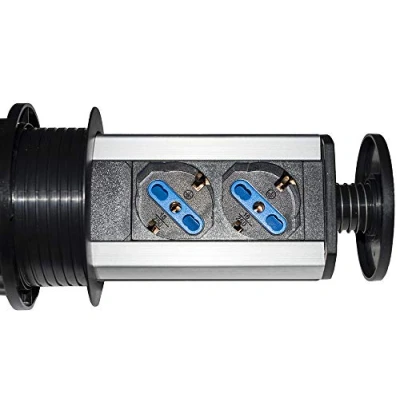 Concealed multi socket for table or shelf mounting It can be taken out and stored in its housing, thus avoiding taking up space on the table, and giving the convenience of having the sockets available on the table. Ideal for offices, or where you need to connect and disconnect power cables quickly. When pulled it stays fixed in place for easy storage with just one press. With 2 universal Schuko/Italiane 10-16A tripolar sockets. Cable length 1.60, with tripolar Italian plugs 16A. Multi-socket diameter 10 cm, height 21 cm