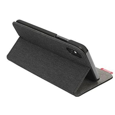 Book-style case for iPhone x and x +, with magnetic fastener Protect your iPhone x against external factors and damage. All of your iPhone x's and still accessible when the case Very slim and soft, yet durable Black surface does not rub off in textile look