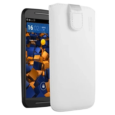 mumbi Genuine leather case Moto G 2. Generation made of cowhide leather With practical Velcro fastener, without belt loop which would only make the case thicker Motorola Moto G 2. Generation bag has a pull-back function. This is how the Moto G 2. generations easily pull out of the bag Inside velvety soft lining to protect the display of the Motorola Moto G 2. generation. This Moto G 2 provides secure protection. Generation leather case against external influences and damage