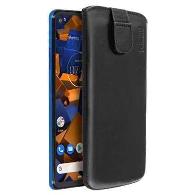 mumbi Genuine Leather Case Made of Cowhide for Motorola One Vision With practical Velcro fastener and without a belt loop (which would make the case thicker) The case has a pull-up strap. So the smartphone can be easily pulled out of the case. The inside is velvety soft to protect the screen of your smartphone. Secure protection with this genuine leather case from external influences and damage